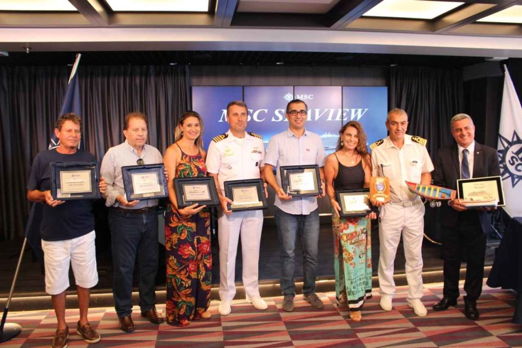 O Município de Porto Belo recebeu nesta quarta-feira (23) o MSC Seaview, o maior navio de cruzeiro a navegar pela costa brasileira. A passagem do transatlântico pela cidade foi marcada por uma cerimônia de troca de placas, que ocorre comumente quando um navio atraca pela primeira vez em um porto. O comandante do navio Giuseppe Galano recebeu como homenagem uma placa das mãos do prefeito em exercício de Porto Belo Elias Cabral e da presidente da Fundação de Turismo Zene Drodowski, que também receberam uma placa das mãos do comandante.