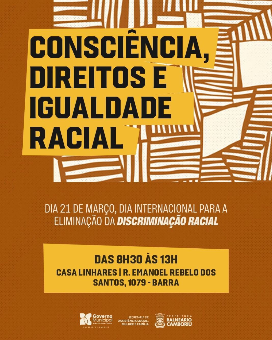 A Secretaria de Assistência Social, Mulher e Família de BC realiza, neste sábado (21), o evento ‘Diálogos pela Igualdade Racial – Consciência, Direitos e Cultura’. A iniciativa busca marcar o Dia Internacional pela Eliminação da Discriminação Racial com programação das 8h30 às 13h na Casa Linhares, no Bairro da Barra.