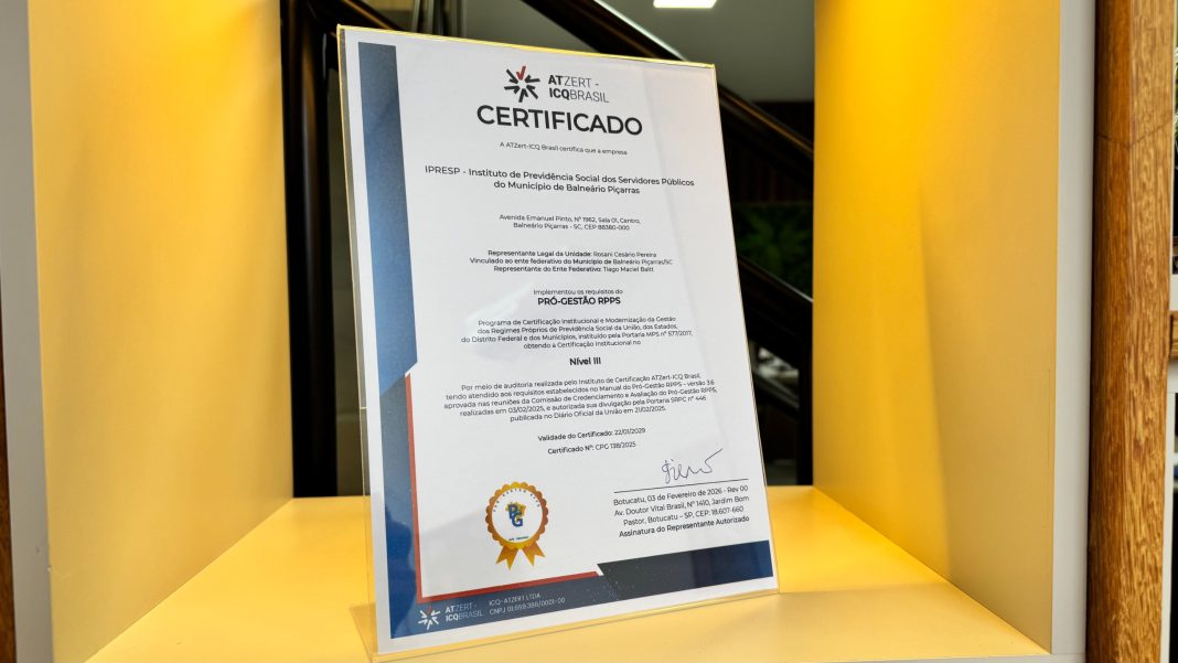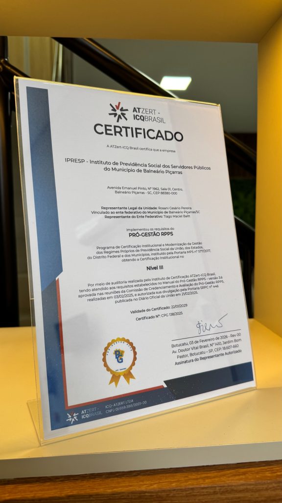 O Instituto de Previdência Social de Balneário Piçarras (IPRESP) alcançou mais uma importante conquista ao obter a certificação Pró-Gestão RPPS – Nível III, concedida pelo Programa de Certificação Institucional e Modernização da Gestão dos Regimes Próprios de Previdência Social. Com esse reconhecimento, Balneário Piçarras passa a integrar o seleto grupo de apenas seis municípios de Santa Catarina que atingiram o nível III da certificação.