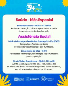 A Secretaria de Assistência Social desenvolve a programação “Bombinhas 34 anos: Cuidar de Gente é Nossa Maior História”, com iniciativas voltadas à valorização das pessoas e geração de oportunidades. Entre os destaques estão o Dia da Mulher Bombinense, no dia 8 de março, o lançamento do Sistema Nacional de Emprego (Sine), no dia 16 de março, e o Feirão de Emprego – Bombinhas Emprega Já, de 16 a 20 de março, fortalecendo o acesso ao mercado de trabalho e o desenvolvimento social.