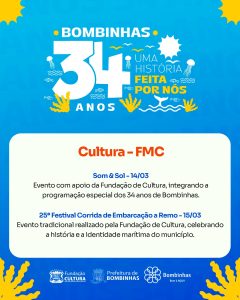 Na área ambiental, a Fundação de Amparo ao Meio Ambiente de Bombinhas (FAMAB) realiza o plantio simbólico “34 Árvores para o Futuro”, de 6 a 31 de março, representando cada ano da história do município. Também fazem parte da programação o Mutirão Ambiental Municipal, de 9 a 13 de março, com ações de limpeza de praias e trilhas, e as atividades de Educação Ambiental nas Praias Bandeira Azul, de 16 a 18 de março, com palestras e oficinas sobre preservação, resíduos e biodiversidade. No dia 15 de março, a partir das 19h, a Feira de Bombas recebe a apresentação artística “Somos do Mar”, integrando arte, cultura e conscientização ambiental às comemorações.