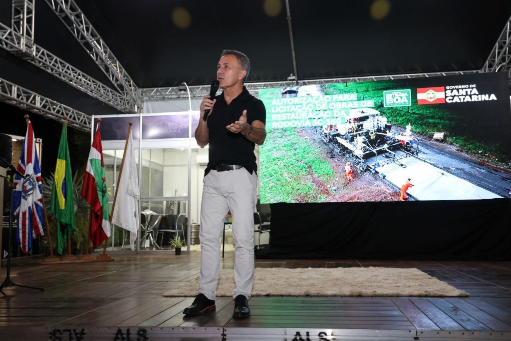 – É uma alegria, uma satisfação estar aqui. Uma feira que impulsiona a economia, o negócio local. Aqui se troca cartão, aqui se faz negócio, as famílias se encontram, tem divertimento, aqui tem alegria e isso faz com que a região se movimente. Mas também vim para assinar mais uma autorização pra SC-350, porque é uma estrada que é carga pesada e nós vamos fazer toda ela de concreto. Dura mais tempo, aguenta o tranco e principalmente traz segurança pra população, pra quem passa por lá – destacou o governador Jorginho Mello.