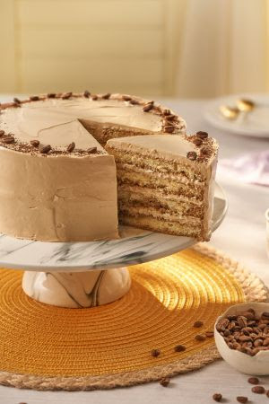 - Coloque a primeira camada de massa no prato de bolo e regue com a calda de café, de modo a deixá-la bem úmida. Coloque um terço do creme de café separado para o recheio e repita o processo com as demais camadas de massa, calda e recheio.