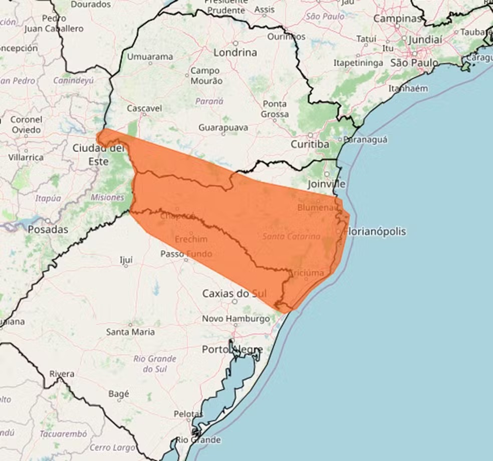 O instituto emitiu alerta laranja (perigo), para grande parte do estado nesta sexta‑feira (24) e sábado (25). O aviso atinge regiões como Oeste, Serra, Vale do Itajaí, Grande Florianópolis e Sul catarinense.
