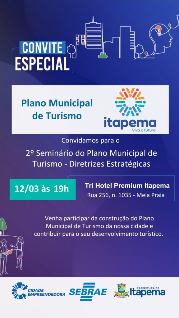 A Prefeitura de Itapema, por meio da Secretaria de Turismo, em parceria com o SEBRAE e com o apoio do Conselho Municipal de Turismo (COMTUR), promove o 2º Seminário do Plano Municipal de Turismo. O evento acontece no dia 12 de março, às 19h, no Tri Hotel Itapema, localizado na Rua 256, nº 1035, bairro Meia Praia.