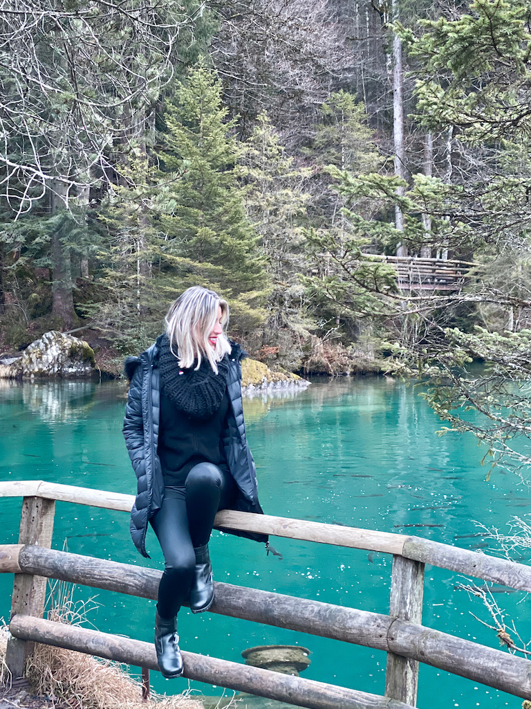 Estava com um pouco de medo de as fotos serem meio fakes, ou que tivessem muito photoshop e a cor do lago não fosse tudo aquilo, mas não. A cor do lago é real e é incrivelmente maravilhosa. Chegamos no Lago Blausee final da tarde, o sol já estava começando a se pôr. Fico imaginando se o sol estivesse batendo na água, quanto mais claro e com as cores mais forte ainda ela estaria.