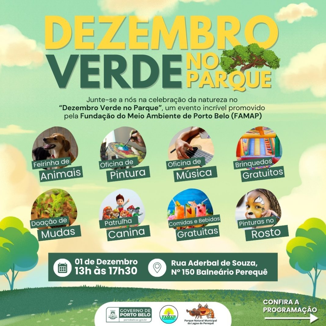 O Governo de Porto Belo, por meio da Fundação Municipal do Meio Ambiente – FAMAP realizará uma tarde de atividades em apoio á campanha Dezembro Verde. O evento acontece no dia 1º de dezembro, das 13h às 17h30, no Parque Natural Municipal Lagoa do Perequê, localizado à Rua Aderbal de Souza, nº 150, bairro Balneário Perequê.