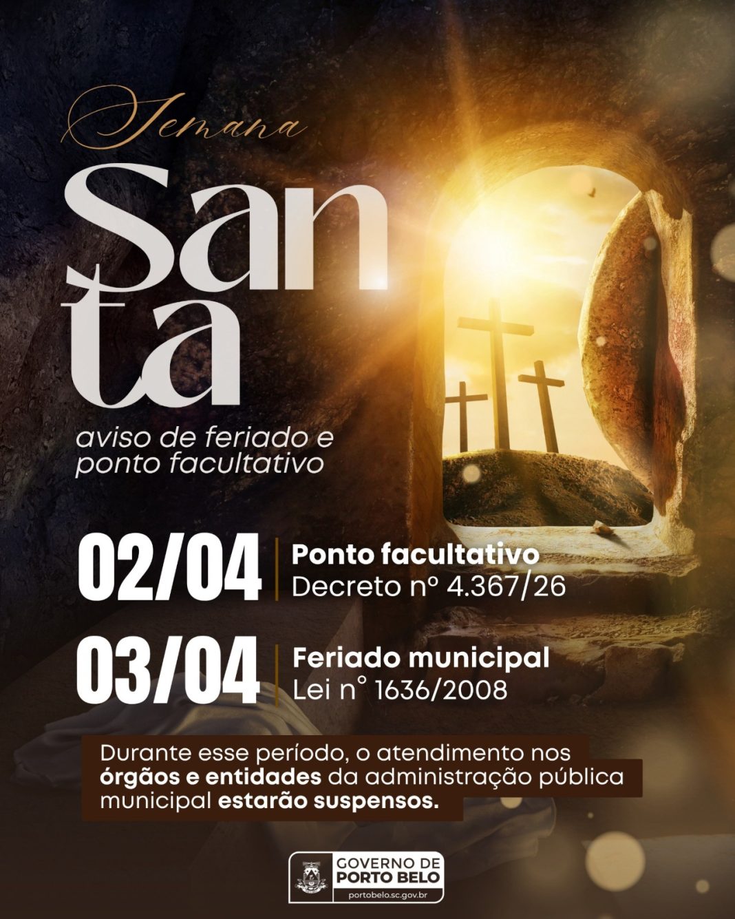 O Governo de Porto Belo informa à população que, em razão das celebrações da Semana Santa, haverá alteração no funcionamento dos serviços públicos municipais. Conforme o Decreto nº 4.367/26, o dia 02 de abril será considerado ponto facultativo. Já no dia 03 de abril, será feriado municipal, conforme estabelece a Lei nº 1.636/2008.