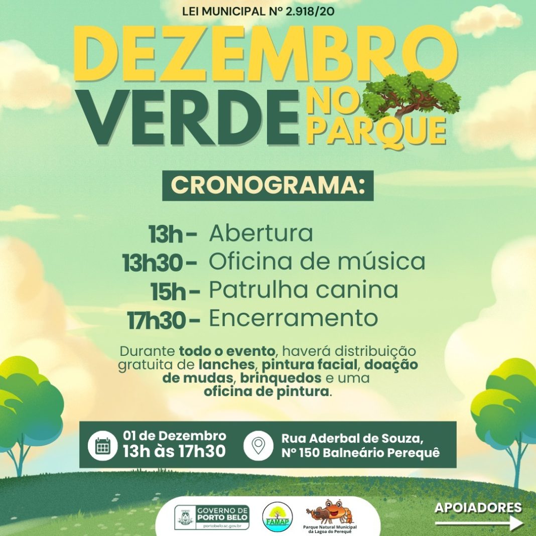 Neste domingo (1º/12), o Governo de Porto Belo, por meio da Fundação Municipal do Meio Ambiente – FAMAP realiza uma tarde de atividades em alusão à campanha Dezembro Verde. O evento acontece das 13h às 17h30, no Parque Natural Municipal Lagoa do Perequê, localizado na rua Aderbal de Souza, nº 150, bairro Balneário Perequê.