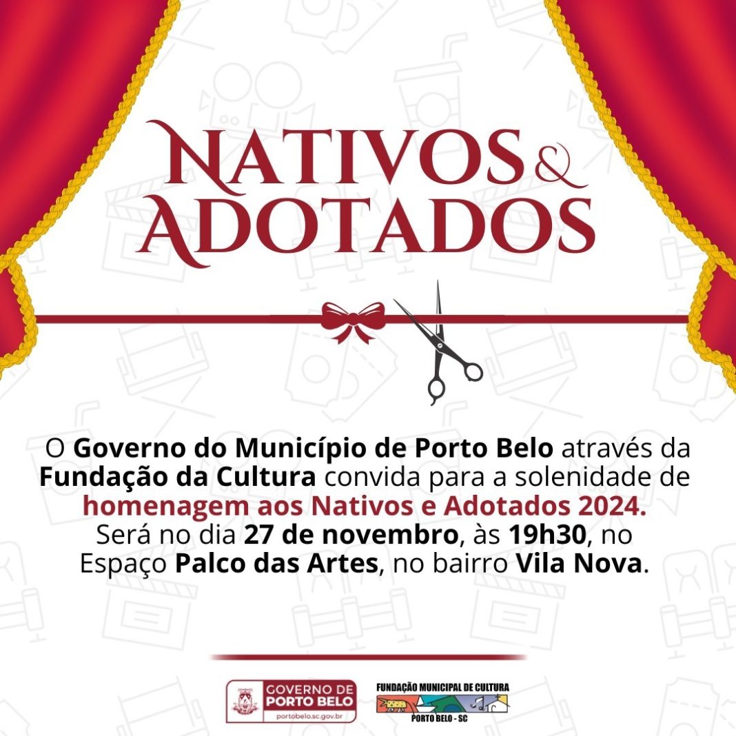 Nesta quarta-feira (27), o município de Porto Belo realiza uma solenidade especial para homenagear os Nativos e Adotados 2024. O evento, promovido pelo Governo Municipal por meio da Fundação Municipal da Cultura, terá início às 19h30 e será realizado no Palco das Artes, no bairro Vila Nova.