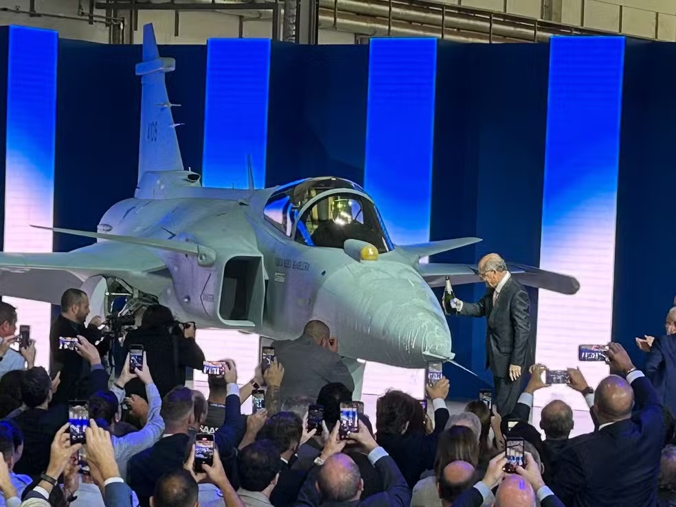 O primeiro caça F-39E Gripen produzido no Brasil foi apresentado nesta quarta-feira (25) ao presidente Luiz Inácio Lula da Silva. A cerimônia de batismo da aeronave supersônica, produzida pela Embraer e pela empresa sueca Saab, ocorreu no Aeródromo Embraer Unidade Gavião Peixoto, em São Paulo. De acordo com o Planalto, a produção da aeronave em território nacional representa um marco que insere o Brasil em “um seleto grupo de nações” com capacidade para desenvolver e produzir aeronaves de combate de alta complexidade – algo inédito na América Latina.