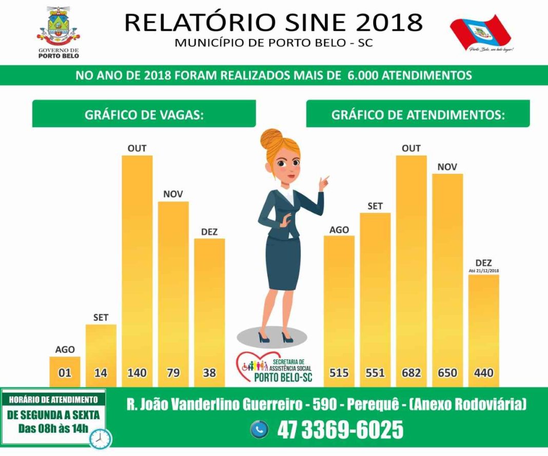 Nos últimos 12 meses, estima-se que a equipe da cidade tenha realizado mais de 6.000 atendimentos. O ponto alto do Sine de Porto Belo foi em outubro de 2018, quando foram ofertadas mais de 140 vagas de emprego, um aumento de 100% comparado a setembro do mesmo ano. Em novembro de 2018, véspera do início da temporada de verão, foram ofertadas mais de 80 oportunidades de trabalho.